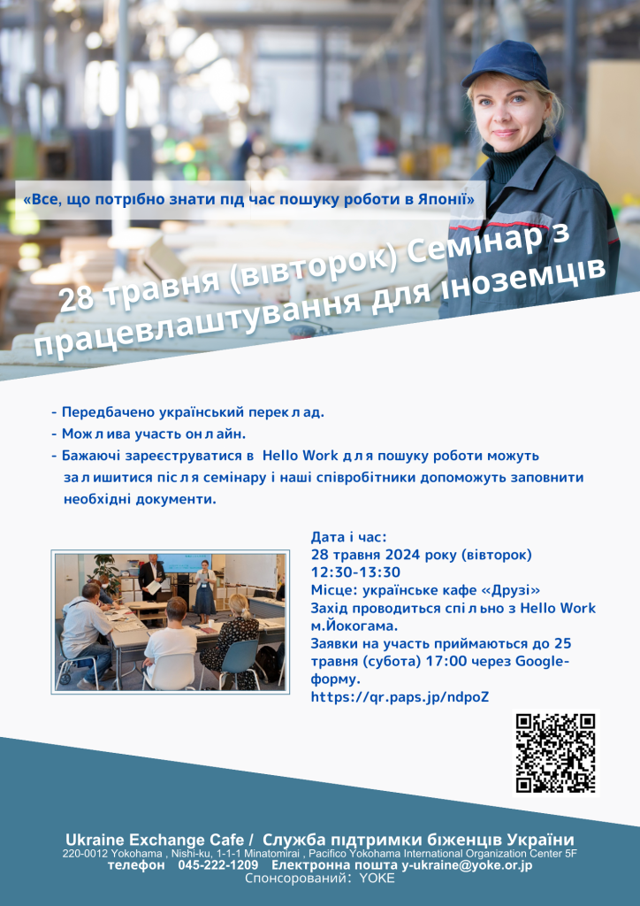 YOKE, спільно з Hello Work м.Йокогама, проводить семінар для тих, хто шукає роботу в Японії або вже має роботу, але хотів би знайти нову, з більш кращими умовами. Можлива участь онлайн. Мова семінару – проста японська, але український переклад теж передбачається.