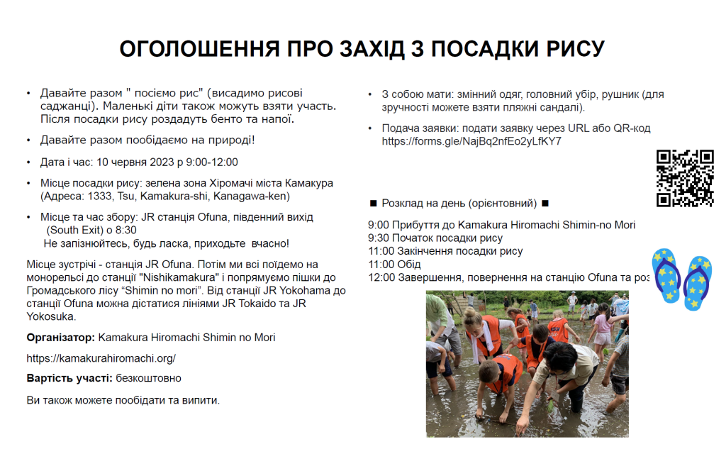 Давайте разом ” посіємо рис” (висадимо рисові саджанці). Маленькі діти також можуть взяти участь. Після посадки рису роздадуть бенто та напої.