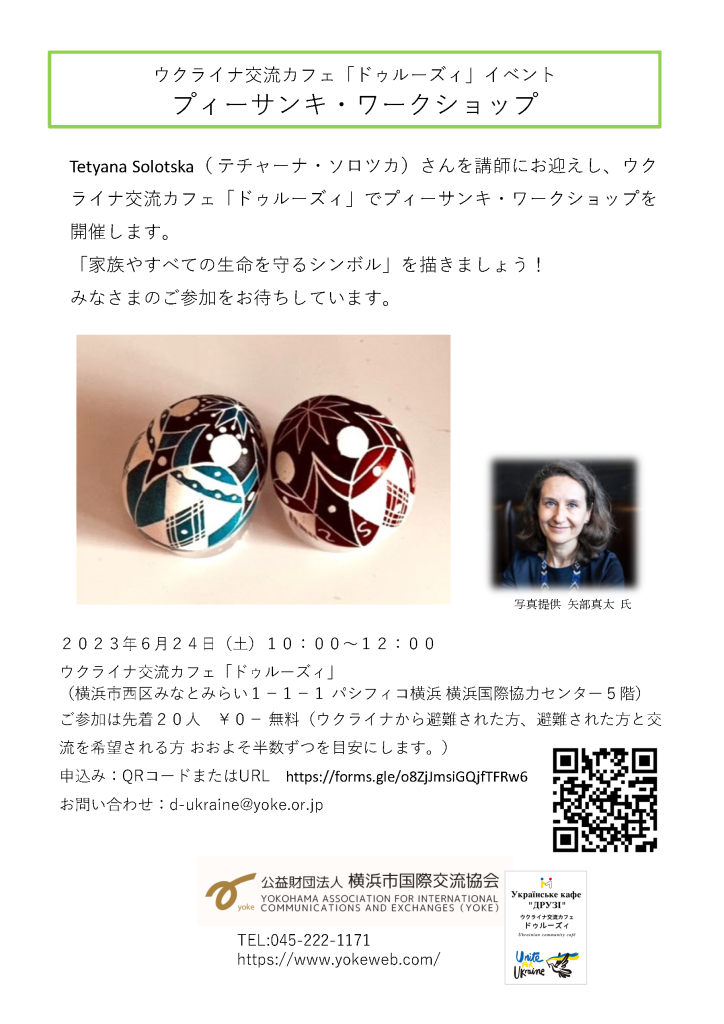 Tetyana Solotska( テチャーナ・ソロツカ)さんを講師にお迎えし、ウクライナ交流カフェ「ドゥルーズィ」でプィーサンキ・ワークショップを開催します。