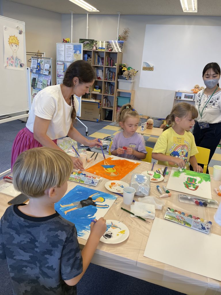 アリョーナさんによる絵画教室では、「夏休みの思い出」をテーマに子どもたちが絵を描きました。筆以外に、ティッシュをつかったり、筆を洗った水で色を塗ったりと自由な発想で楽しんでいました。