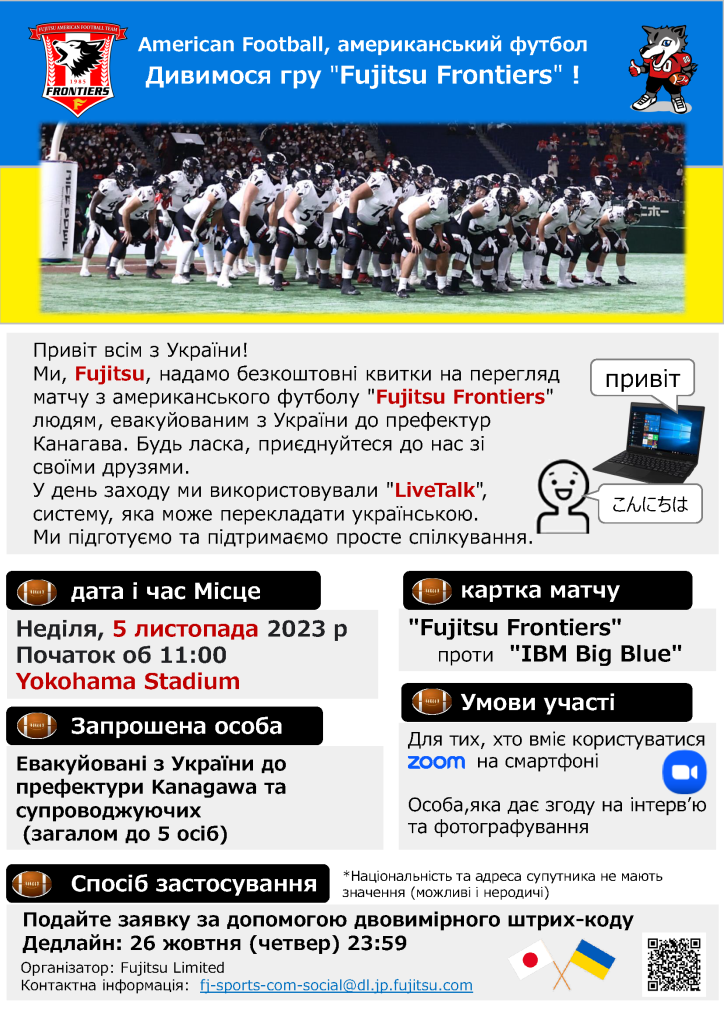Ми, Fujitsu, надамо безкоштовні квитки на перегляд матчу з американського футболу “Fujitsu Frontiers” людям, евакуйованим з України до префектур Канагава. Будь ласка, приєднуйтеся до нас зі