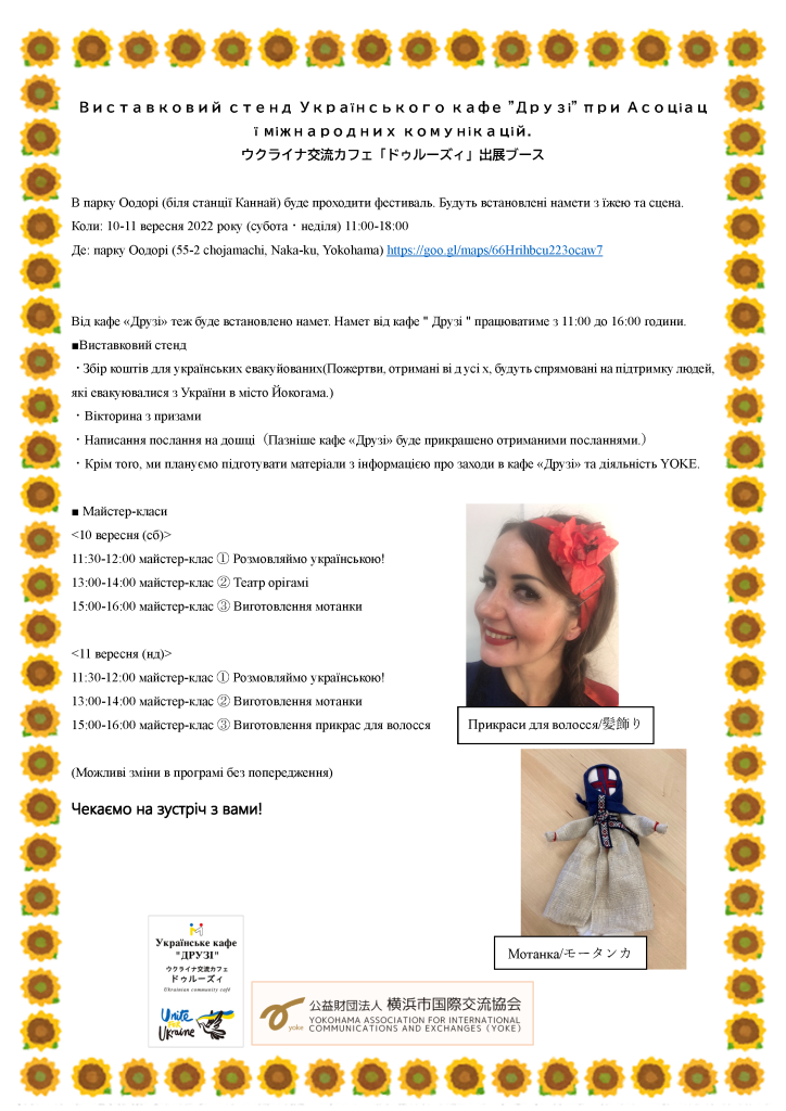 ・Збір коштів для українських евакуйованих(Пожертви, отримані ві д усі х, будуть спрямовані на підтримку людей, які евакуювалися з України в місто Йокогама.)