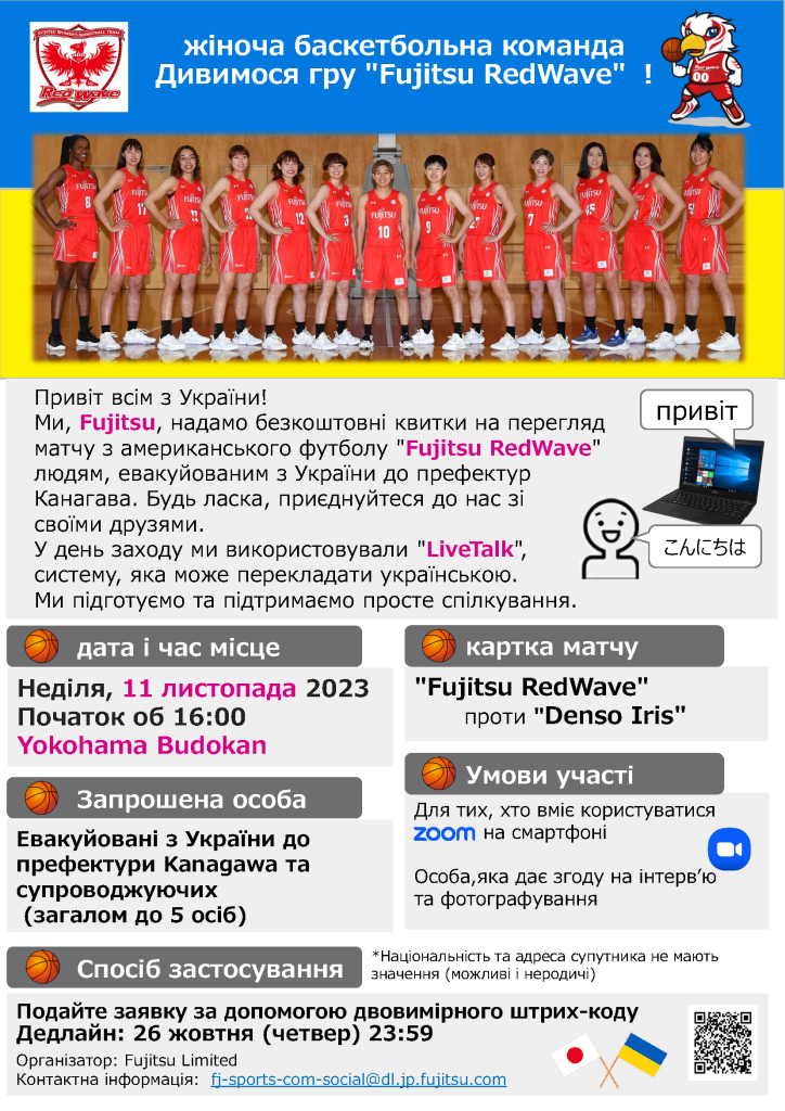Ми, Fujitsu, надамо безкоштовні квитки на перегляд матчу з мериканського футболу “Fujitsu RedWave” людям, евакуйованим з України до префектур