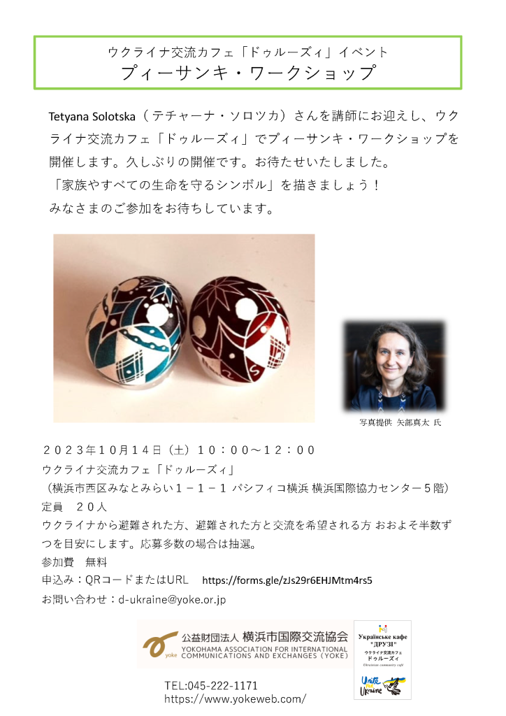 Tetyana Solotska( テチャーナ・ソロツカ)さんを講師にお迎えし、ウクライナ交流カフェ「ドゥルーズィ」でプィーサンキ・ワークショップを開催します。久しぶりの開催です。