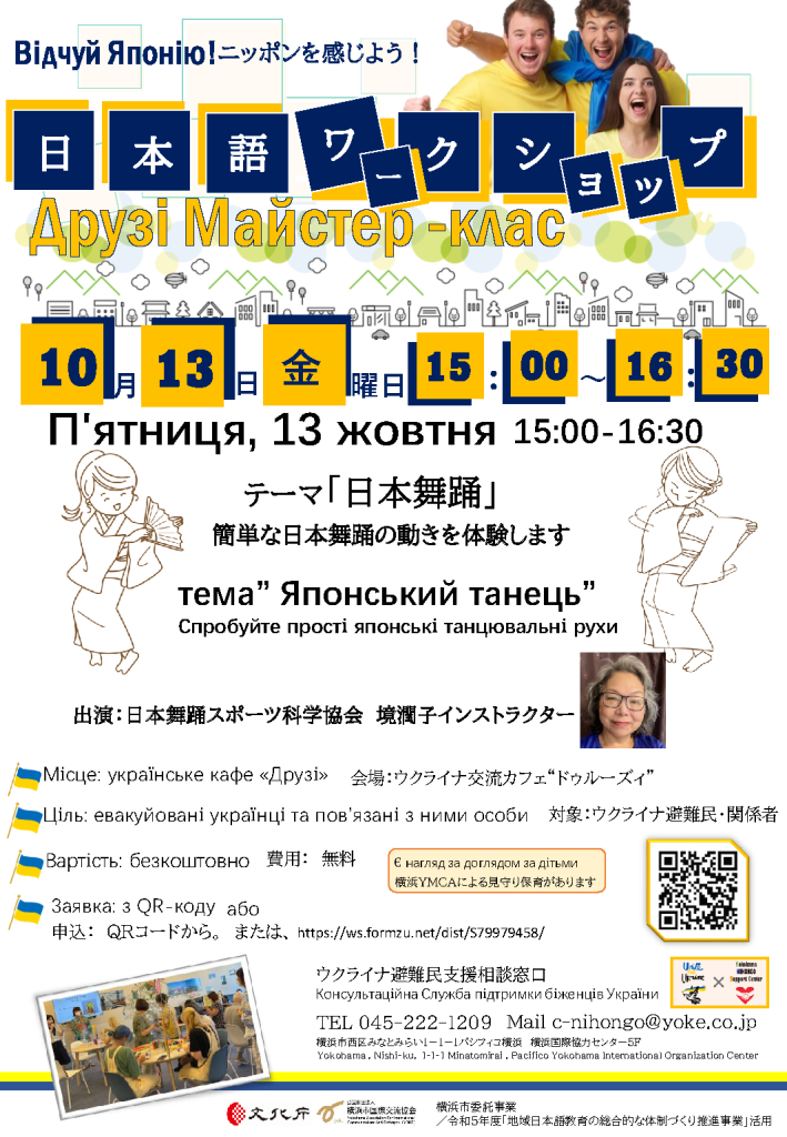 【参加者募集】日本語ワークショップ 2023/10/06 イベント情報 こちらはウクライナ避難民・関係者を対象としたイベントです。 10月13日金曜日15:00-16:30 会場 ウクライナ交流カフェ「ドゥルーズィ」 テーマ 「日本舞踊」 簡単な日本舞踊の動きを体験します。 費用 無料 申込みはこちらから