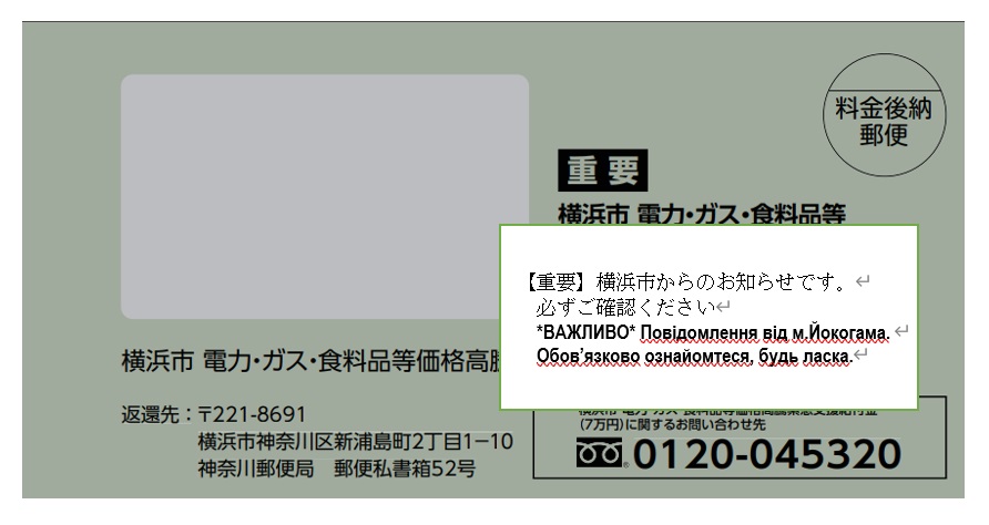 横浜市からこのような封筒が、あなたにとどくかもしれません。中には、給付金(きゅうふきん)についての書類が入っています。日本語の書類ですが、Google レンズを使えばウクライナ語で読むことができます。