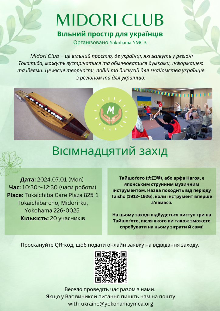 Шановні учасники, на вісімнадцятому заході Midori club відбудеться виступ гри на музичному інструменті Тайшоґото, після якого ви також зможете спробувати на ньому зіграти й самі!