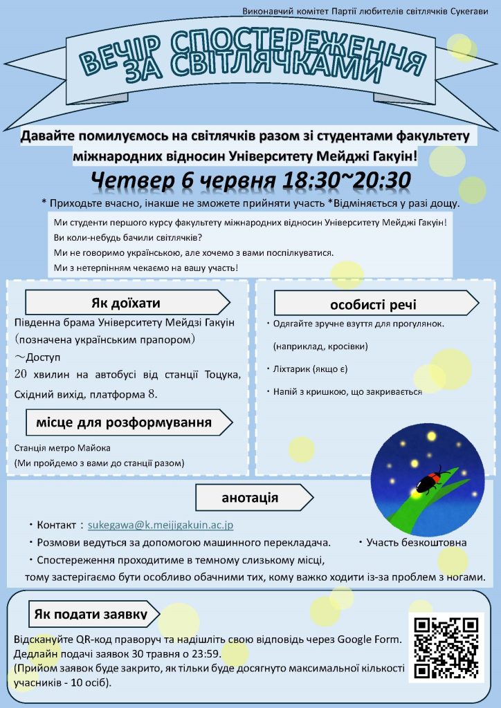 Я піду подивитися на світлячків зі студентами з Університету Мейдзі Гакуїн. Якщо ви бажаєте взяти участь, подайте заявку тут.