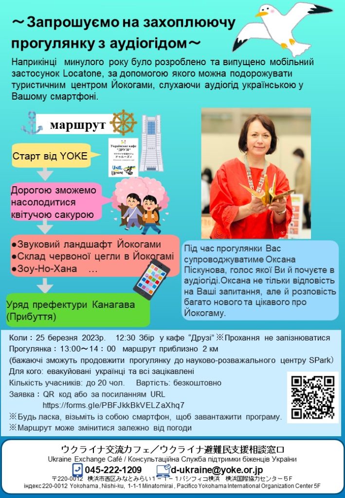 Наприкінці минулого року було розроблено та випущено мобільний застосунок Locatone, за допомогою якого можна подорожувати туристичним центром Йокогами, слухаючи аудіогід українською у Вашому смартфоні.